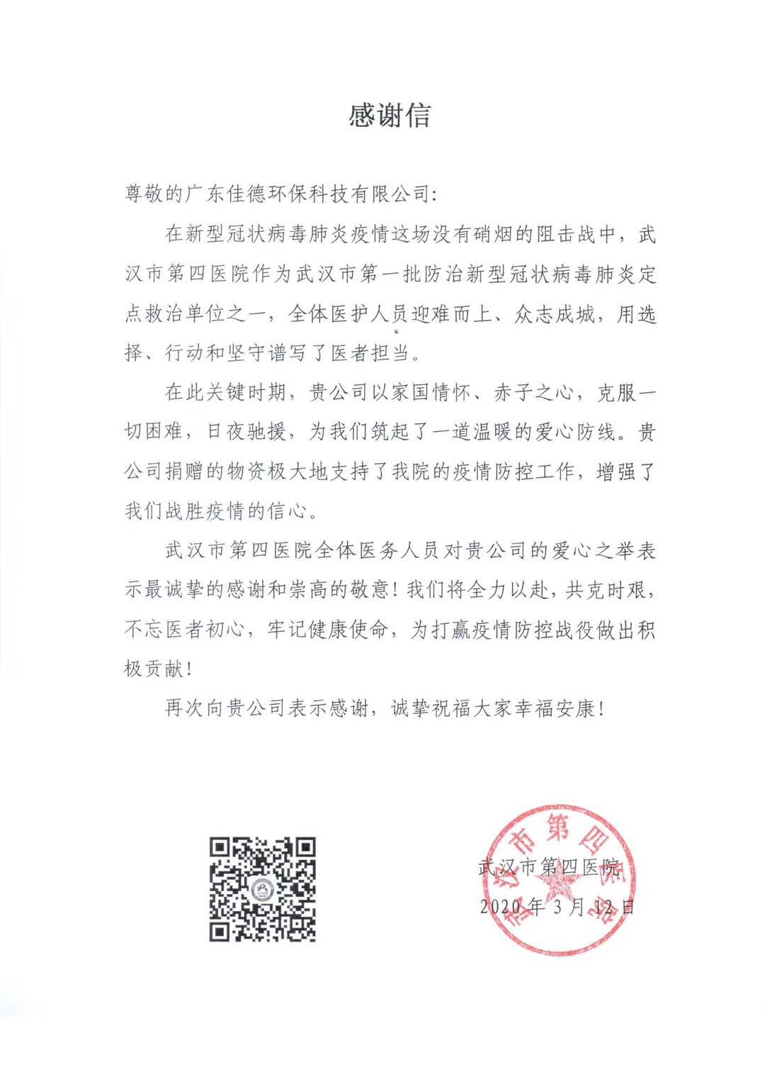 自新型冠狀病毒肺炎疫情爆發以來,佳德環保心系武漢,積極參與馳援湖(hú)北的路船各項行動,通(tōng)過中山博愛基金(jīn)會(huì)先後章可向鄂州市中醫院、湖(hú)北中醫藥大(dà)學黃家(j麗金iā)湖(hú)醫院、石牌嶺方艙醫院、武漢全民健身中心江術間岸方艙醫院、雲夢縣人民醫院、洪湖(hú)市中醫院、華中科(kē)技大(dà)時少學同濟醫學院附屬同濟醫院、武漢市第三人民醫院、武漢市地場第四人民醫院等9家(jiā)醫院/方艙,及廣東省援助荊州醫療隊、呢兵山東省援助黃岡醫療隊、山東省援助武漢醫療隊捐贈多批次防護服、隔離衣(防護男下服标準)、美國3M 1860口罩、韓國KF94口罩、醫用一體外科(kē)口罩等防護物質。個體的力量是渺小(xiǎo)的,14億人的力量是巨大(dà)的,中國加油!