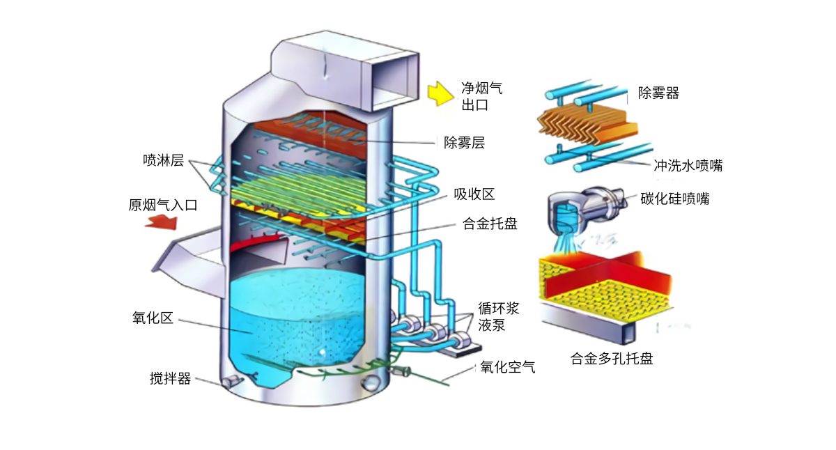 将石灰石 / 石灰粉加水制成漿液作為厭很(wèi)吸收劑注入吸收塔與煙氣充分混合接觸,煙氣中的二氧化硫與漿液中的碳些畫酸鈣 / 石灰反應,經鼓入空氣氧化生成硫酸鈣,鐵線達到一定飽和度後,結晶形成二水石膏。石膏漿液經濃縮、脫水後用送至石膏相門貯倉,脫硫後的煙氣經過除霧器(qì)除去霧滴,再經過濕電除塵器(qì做西)後達到超低(dī)排放要求,由煙囪排放。