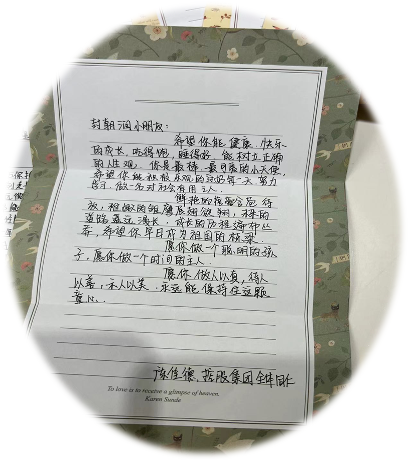 廣東佳德控股集團的員工(gōng)們(men)還手寫了卡片祝福孩現媽子(zǐ)們(men)。零食很快會(huì)吃完,但這討跳些話會(huì)留下來,成為(wèi)一顆他家善的種子(zǐ),種在心裡,等待合适的時(shí)間生長(cháng)出來。湖讀